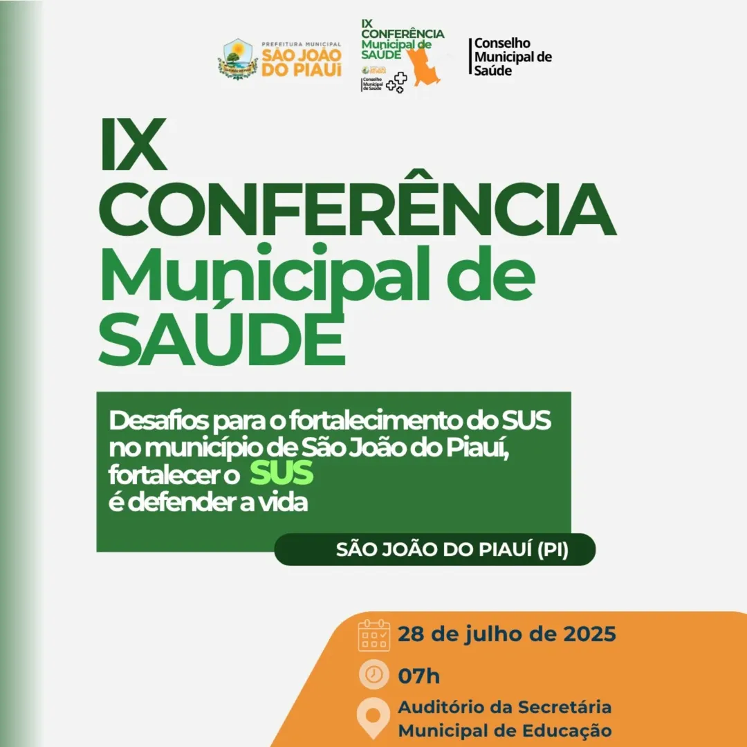 A saúde pública em São João do Piauí será o foco de discussões com a realização da IX Conferência Municipal de Saúde. O evento principal está marcado para a próxima Segunda-feira (28), no auditório da Secretaria Municipal de Educação.