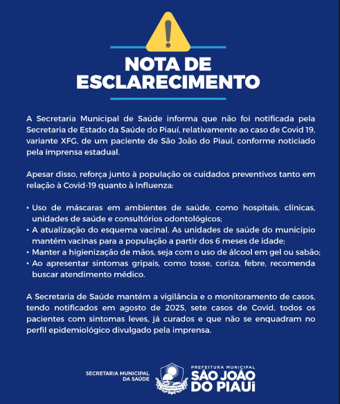 A Secretaria Municipal de Saúde de São João do Piauí emitiu uma nota oficial contestando uma informação, divulgada pela imprensa estadual, sobre a identificação da variante XFG da Covid-19 em um paciente do município. No comunicado, a secretaria afirma que não recebeu notificação formal da Secretaria de Estado da Saúde do Piauí (Sesapi) a respeito do caso.