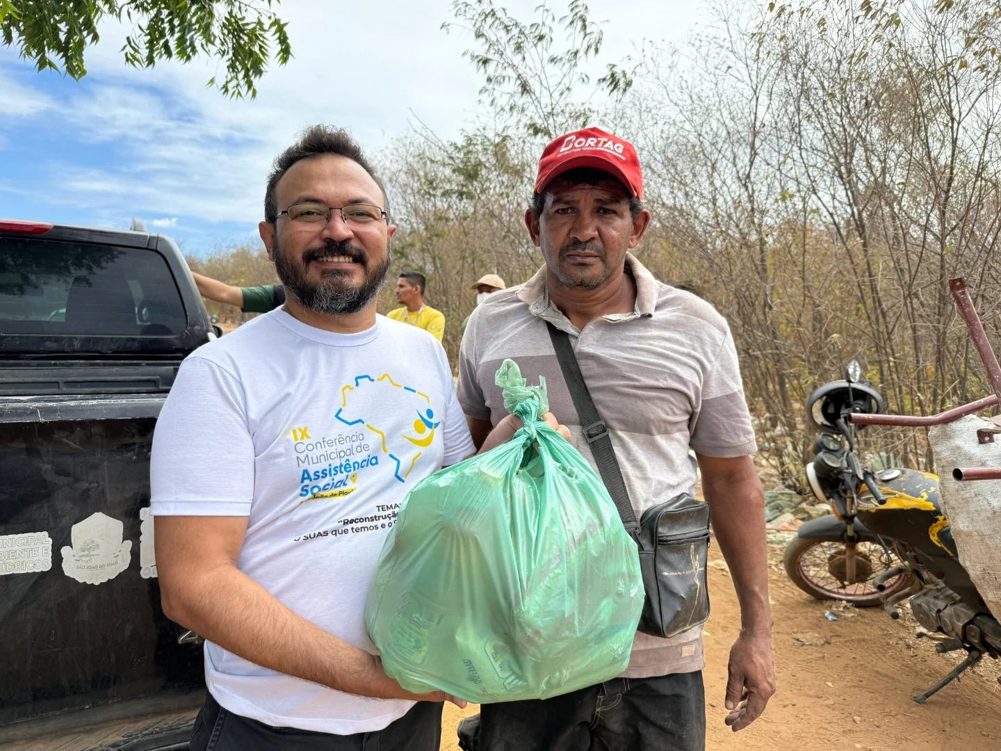 Durante a visita, os Agentes de Reciclagem também receberam cestas de alimentos. Essa ação de segurança alimentar é realizada de forma permanente pela Assistência Social do Município, oferecendo suporte contínuo a esses trabalhadores.